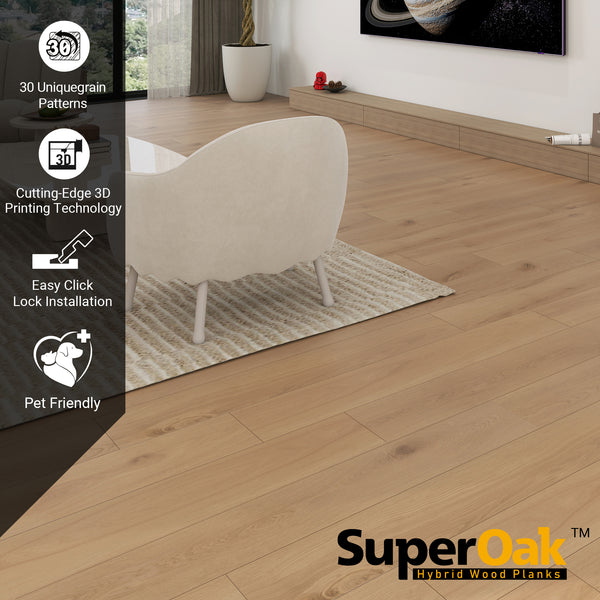 Transform your space with SUPEROAK LITE, a premium 9.5mm Hybrid Wood Plank that merges innovation, durability, and timeless aesthetics. Engineered with cutting-edge 3D printing technology, this flooring solution replicates the beauty of natural wood with unparalleled realism and depth. The Boundless Pattern ensures a seamless, non-repetitive grain, creating a sophisticated and authentic wood-look floor.
